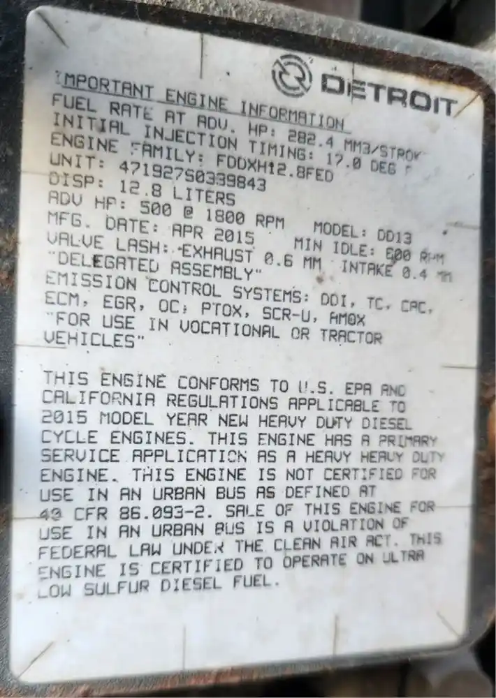 (Used) 2015 Detroit DD13, ENGINE ASSEMBLY- Family Number: FDDXH12.8FED, Displacement: 12.8L, Horsepower: 500, Serial Number: 471927S0339843, Part Number: C01-00235-756, E.C.S: DDI, TC, CAC, ECM, EGR, OC, PTOX, SCR-U, AMOX,