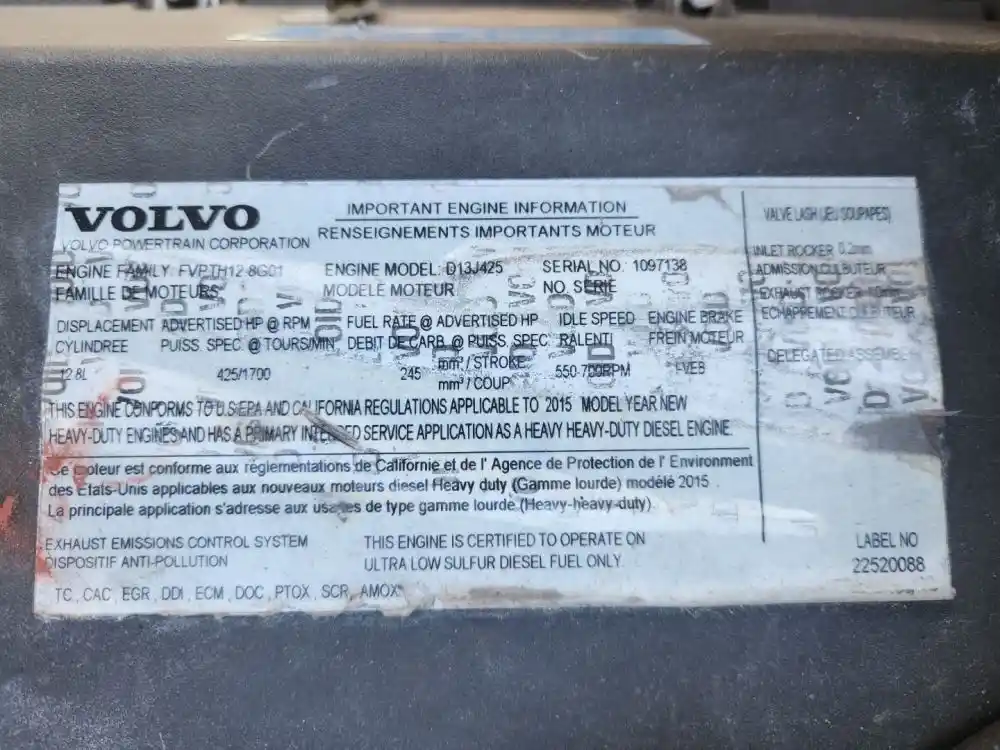 (Used) 2015 Volvo D13, ENGINE ASSEMBLY- Family Number: FVPTH12.8G01, Displacement: 12.8L, Horsepower: 425, Serial Number: 1097138, Part Number: 22520088, E.C.S: TC, CAC, EGR, DDI, ECM, DOC, PTOX, SCR, AMOX,