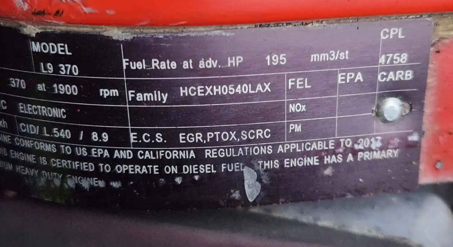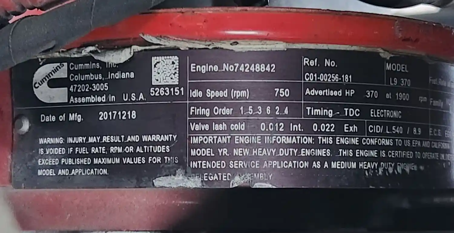 (Used) 2017 Cummins L9 370, ENGINE ASSEMBLY- Family Number: HCEXH0540LAX, Displacement: 8.9L, Horsepower: 370, Ar.No./CPL: 4758, Serial Number: 74248842, Part Number: C01-00256-181, E.C.S: EGR, PTOX, SCRC,