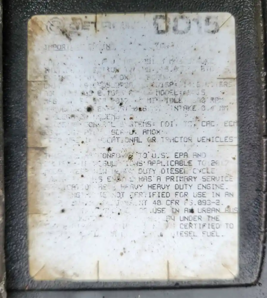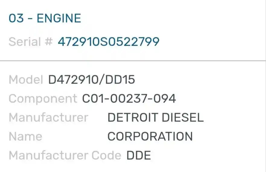 (Used) 2017 Detroit DD15, ENGINE ASSEMBLY- Family Number: HDDXH14.8EAD, Displacement: 14.8L, Horsepower: 505, Serial Number: 472910S0522799, Part Number: C01-00237-094, E.C.S: DDI, TC, CAC, ECM, EGR, OC, PTOX, SCR-U, AMOX,