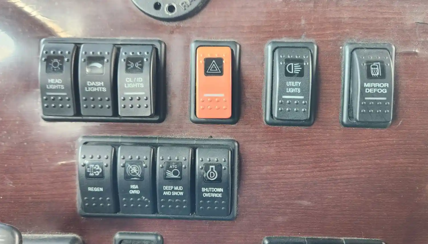 (Used) 2018 Western Star 5700, MISCELLANEOUS DASH SWITCHES- Controls: Headlights, Dash Lights, CL/ID Lights, Hazard Lights, Utility Lights, Mirror Defog, Sleeper Lights, Susp Hgt, Fifth Wheel Slide, Inter Axle Diff Lock, Material: Aluminum with Plastic, Reference images for condition,