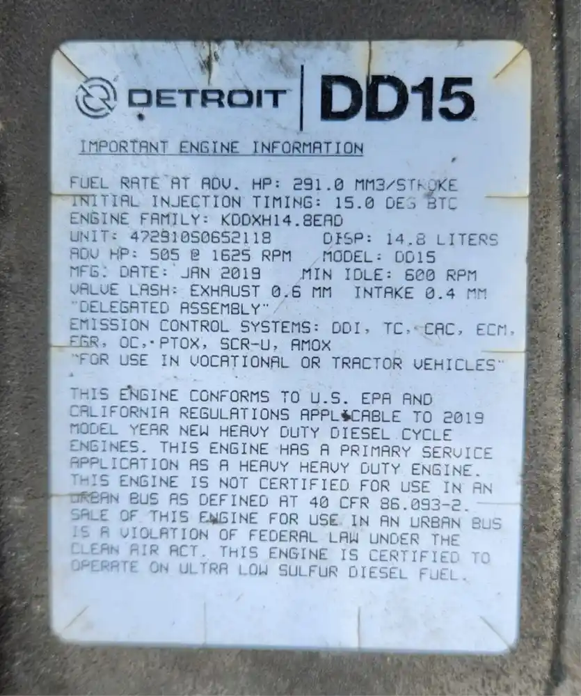 (Used) 2019 Detroit DD15, ENGINE ASSEMBLY- Family Number: KDDXH14.8EAD, Displacement: 14.8L, Horsepower: 505, Serial Number: 472910S0652118, Part Number: C01-00237-805, E.C.S: DDI, TC, CAC, ECM, EGR, OC, PTOX, SCR-U, AMOX,