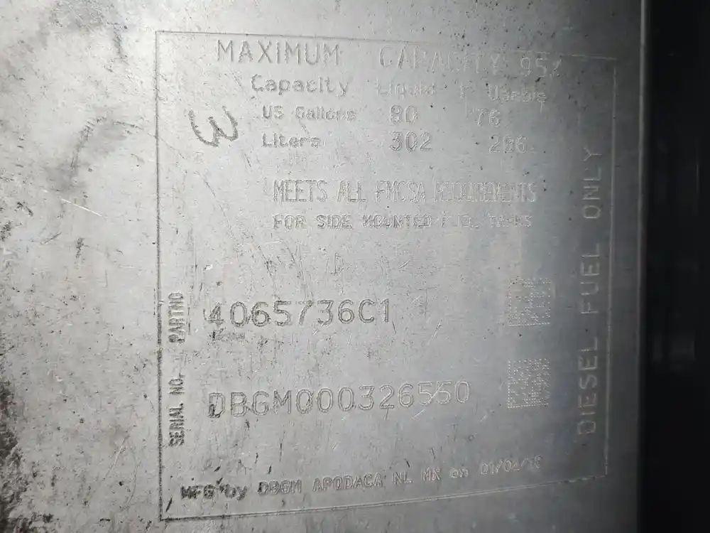 (Used) 2019 International LT625, FUEL TANK- Part Number: 4065736C1, Serial Number: DBGM000326550, Side: Passenger Right Side, Capacity: 80 Gallons, Material: Aluminum, Shape: Cylinder, Dimensions: L=36", D=26.5",