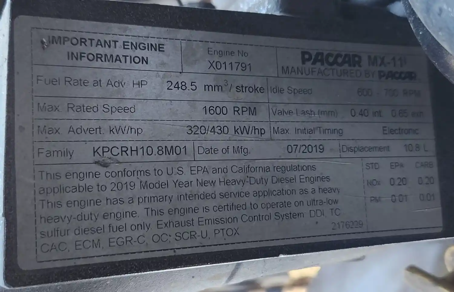 (Used) 2019 PACCAR MX11, ENGINE ASSEMBLY- Family Number: KPCRH10.8M01, Displacement: 10.8L, Horsepower: 430, Serial Number: X011791, E.C.S: DDI, TC, CAC, ECM, EGR-C, OC, SCR-U, PTOX,