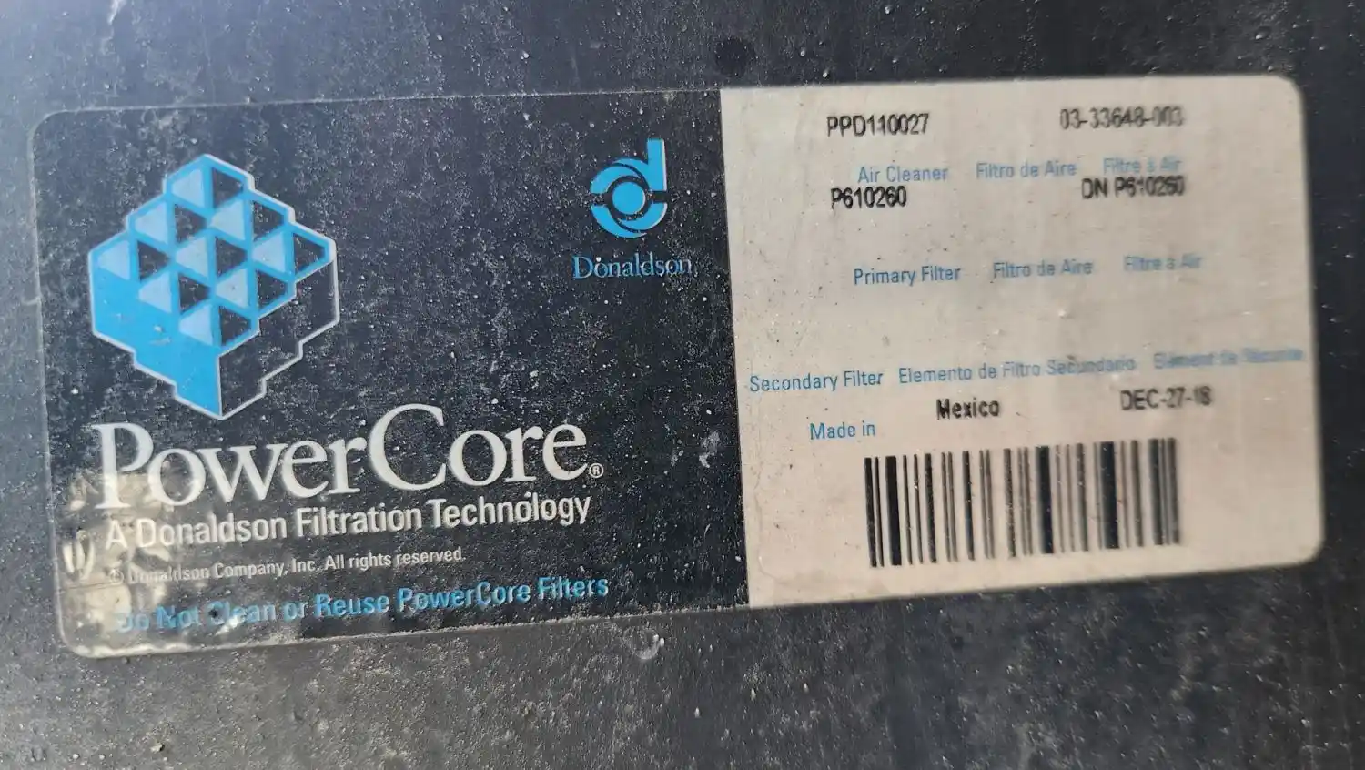 (Used) 2020 Freightliner Cascadia 125, AIR CLEANER- Part Number: PPD110027, Side: Center Of Truck, Color: Black, Material: Plastic, Engine: Detroit DD15, Dimensions: L=33", W=27", Reference images for condition,