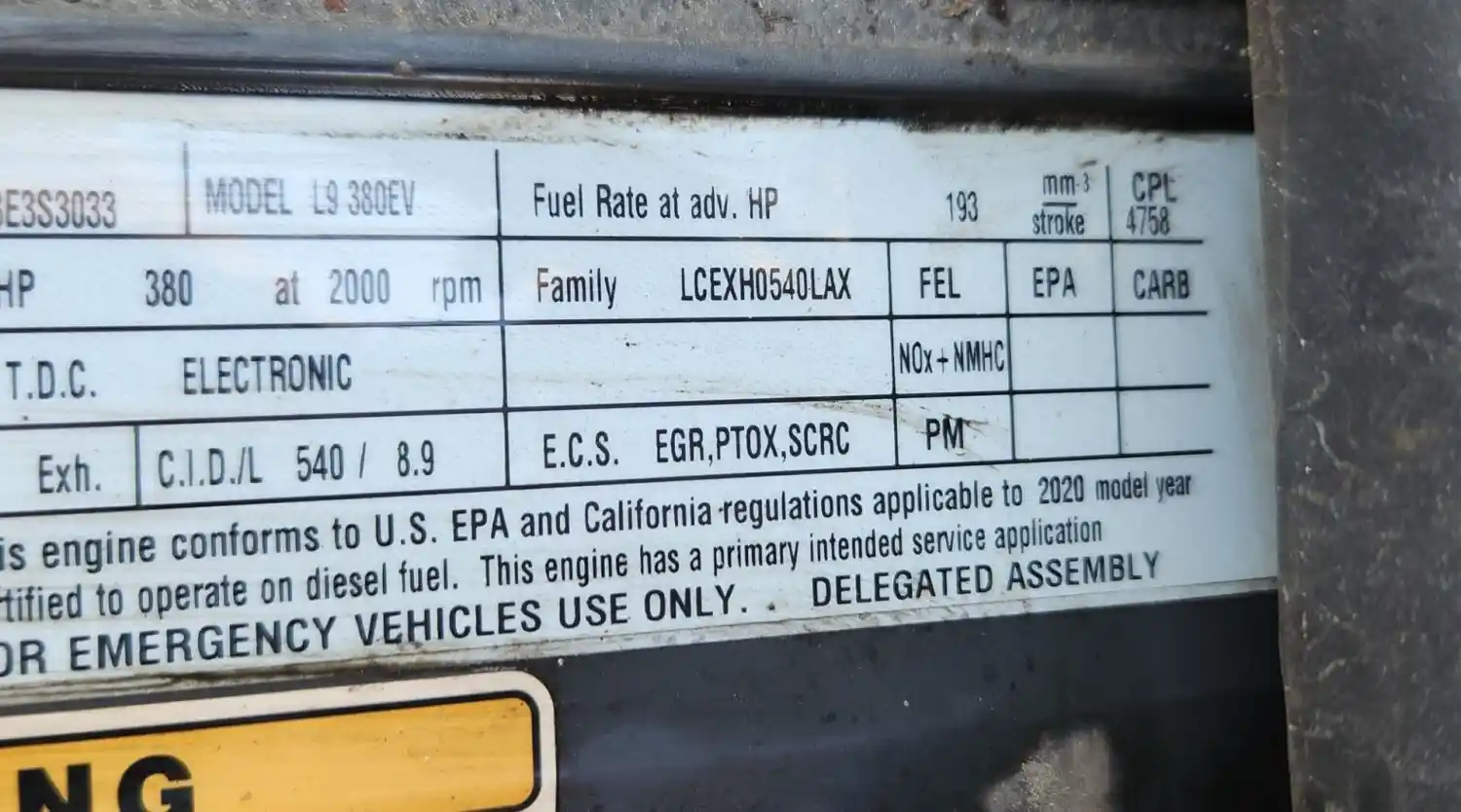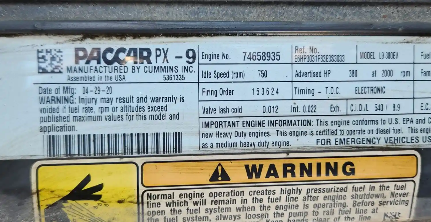 (Used) 2020 PACCAR PX-9, ENGINE ASSEMBLY- Family Number: LCEXH0540LAX, Displacement: 8.9L, Horsepower: 380, Ar.No./CPL: 4758, Serial Number: 74658935, Part Number: E6HP3031F83E3S3033, E.C.S: EGR, PTOX, SCRC,