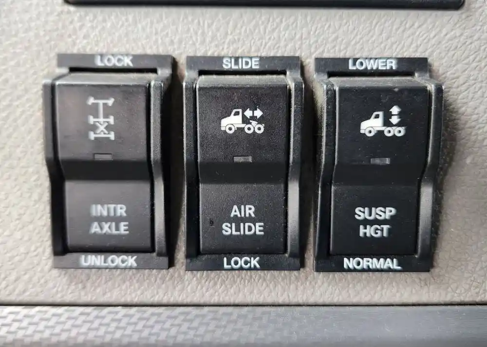 (Used) 2021 Freightliner Cascadia 126, MISCELLANEOUS DASH SWITCHES- Controls: Inter Axle Diff Lock, Air Slide, Susp Hgt, Material: Plastic, Reference images for condition,