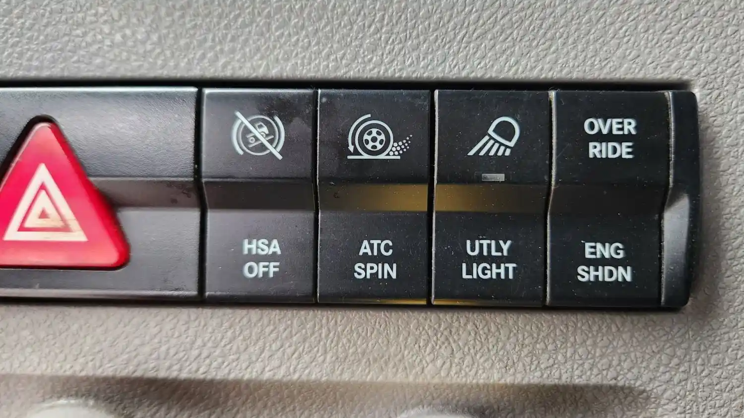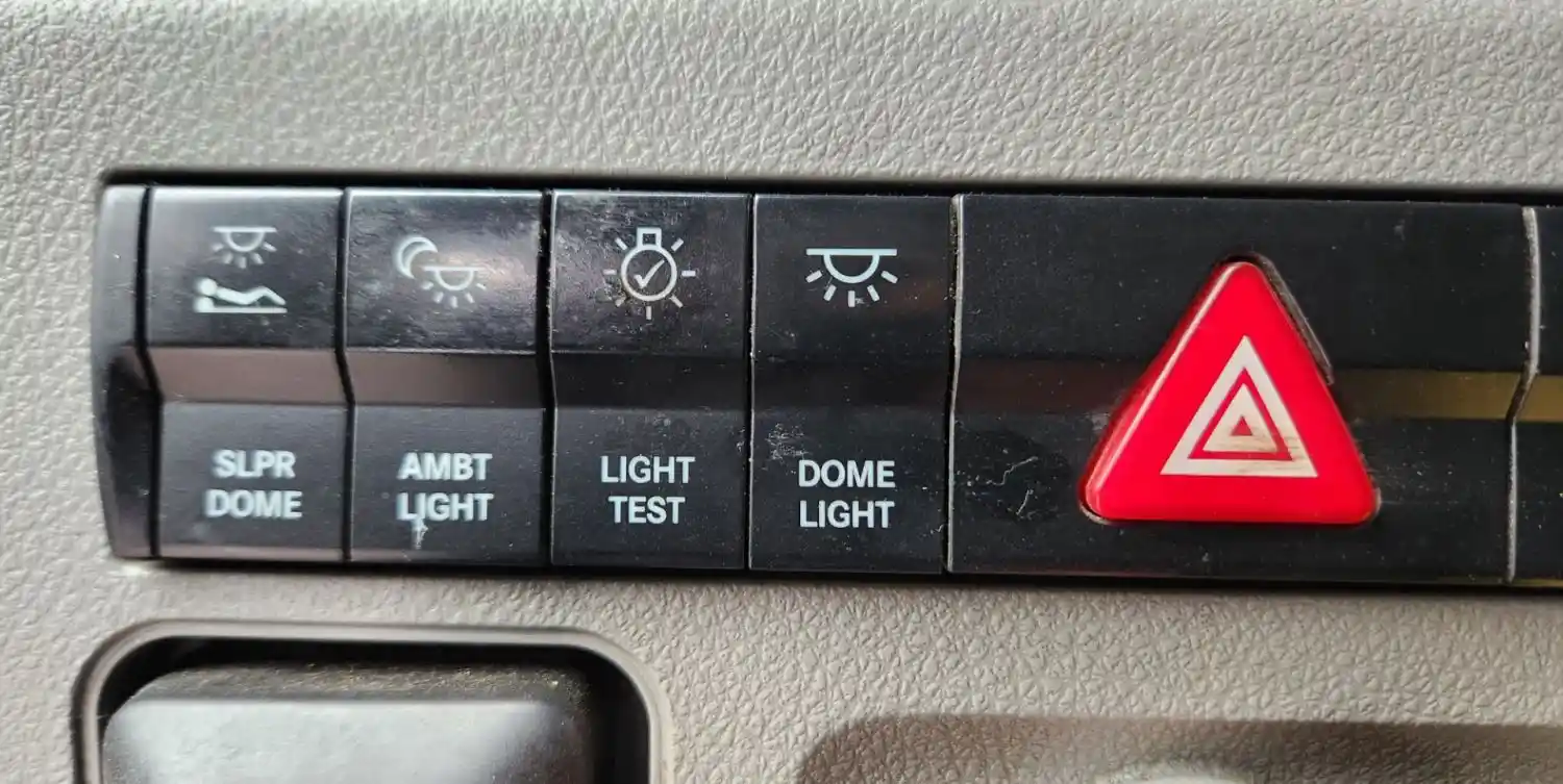 (Used) 2021 Freightliner Cascadia 126, MISCELLANEOUS DASH SWITCHES- Controls: Sleeper Dome, Ambt Light, Light Test, Dome Light, Hazard Lights, HSA Off, Atc Spin, Utly Light, Override Eng Shdn, Material: Plastic, Reference images for condition,