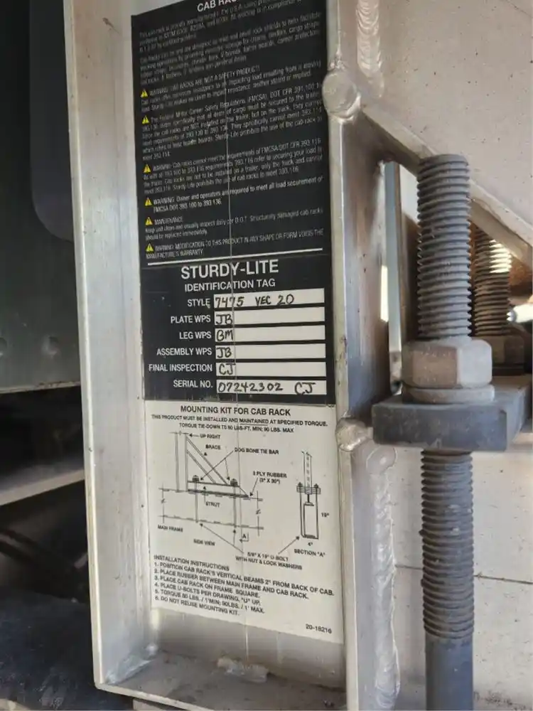 (Used) 2023 Kenworth T680, ALUMINUM HEADACHE RACK WITH CHAIN HOLDERS AND BOX- Serial Number: 07242302, Make: STURDY-LITE, Material: Aluminum, Dimensions: W=7.1FT, H=6.1FT, L=1.8FT", Minor Damage!! Reference images for condition,