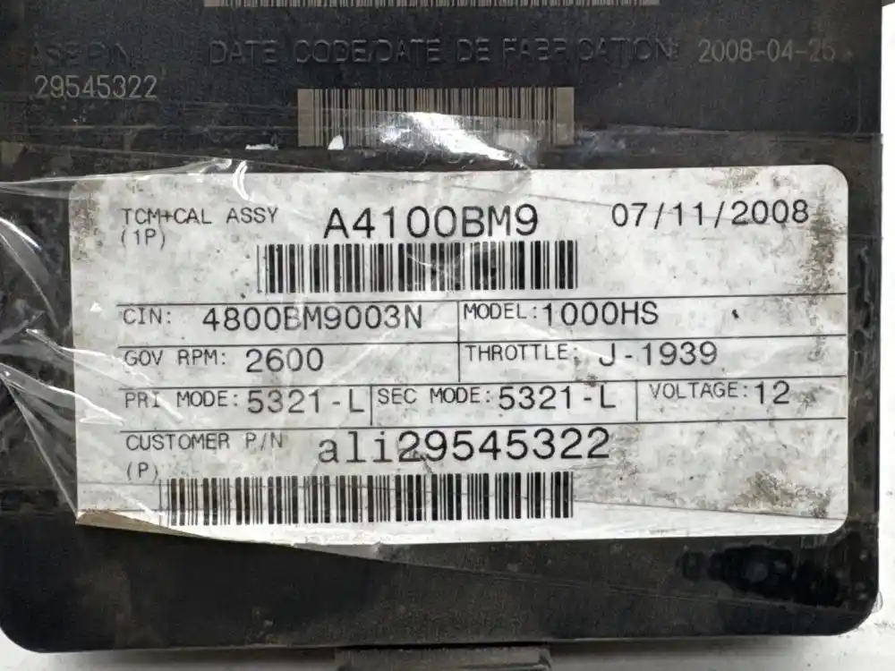 (Used)Allison 2009 1000HS (AT), TRANSMISSION ECM- Part Number: 29545322, Serial Number: BK5322N18115EHF2, A4100BM9, CIN: 4800BM9003N, GOV RPM: 2600, THROTTLE: J-1939, 12 Volts, A41, E11, 022849, 10 R 022849, Supplier Part Number: ATA4103, Base Pin Number: 29545322, Plug Pins: 80 Pins Plug Rectangular, Reference images for condition. ,